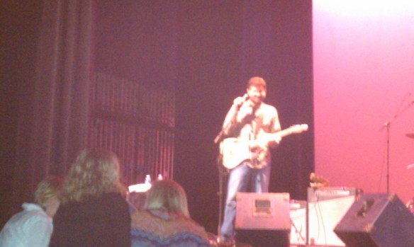 ” Gotta like that 3:2 ratio”, I nodded with approval as I pocketed the coupon tickets from co-promoter George Whitesell and headed across the street to La’au’s Taco Shop for my complimentary three tacos and two beers. Having conned the clueless Editors into buying me a $40 ticket to the show– quite reasonable for a fine artist like Tab in today’s inflated ticket market- I was regaling in the fine VIP package arranged by George and Amy and looking forward to cashing in not only my coupons, but those of my recently-jettisoned ahem, escort, whom I’d sent on a fool’s errand once we hit the campus. ( How many times will they fall for that, ” how bout running in and getting us some lotto tix while I circle the block?”).  Now, six tacos and four beers, that’s what I’m talkin’ about! So I skipped across the street to La’au’s , grabbed the first two beers and a clever upright stand loaded with three tasty chicken tacos, and settled in to some great Hill Country-style blues from Grant Sabin. His set was yet another VIP perk, and when he strummed into R. L. Burnside’s  ” Po Black Maddie”, even Luther Dickinson himself would have been proud. Tacos, beer, and blues – what a concept!