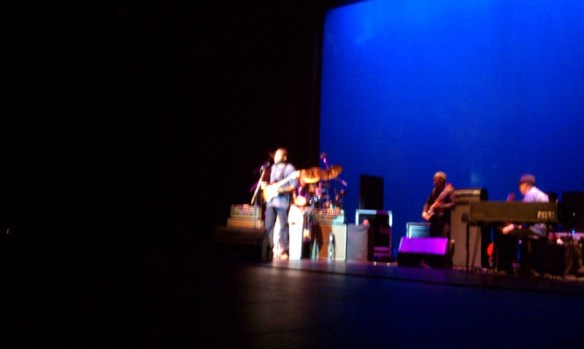 Just a note on why the band was set back on the stage, unfortunately. The theater has a “fire curtain” that comes down stage front, right behind the half circle of the orchestra pit. Legally, there can’t be any set-up below the fire curtain, which means it has to be squeezed into the section above the orchestra pit up front, or set back on the stage, farther away from the audience. I was a bit disappointed also, but it was an AWESOME show for ol’ Livermore! The house was rockin’!