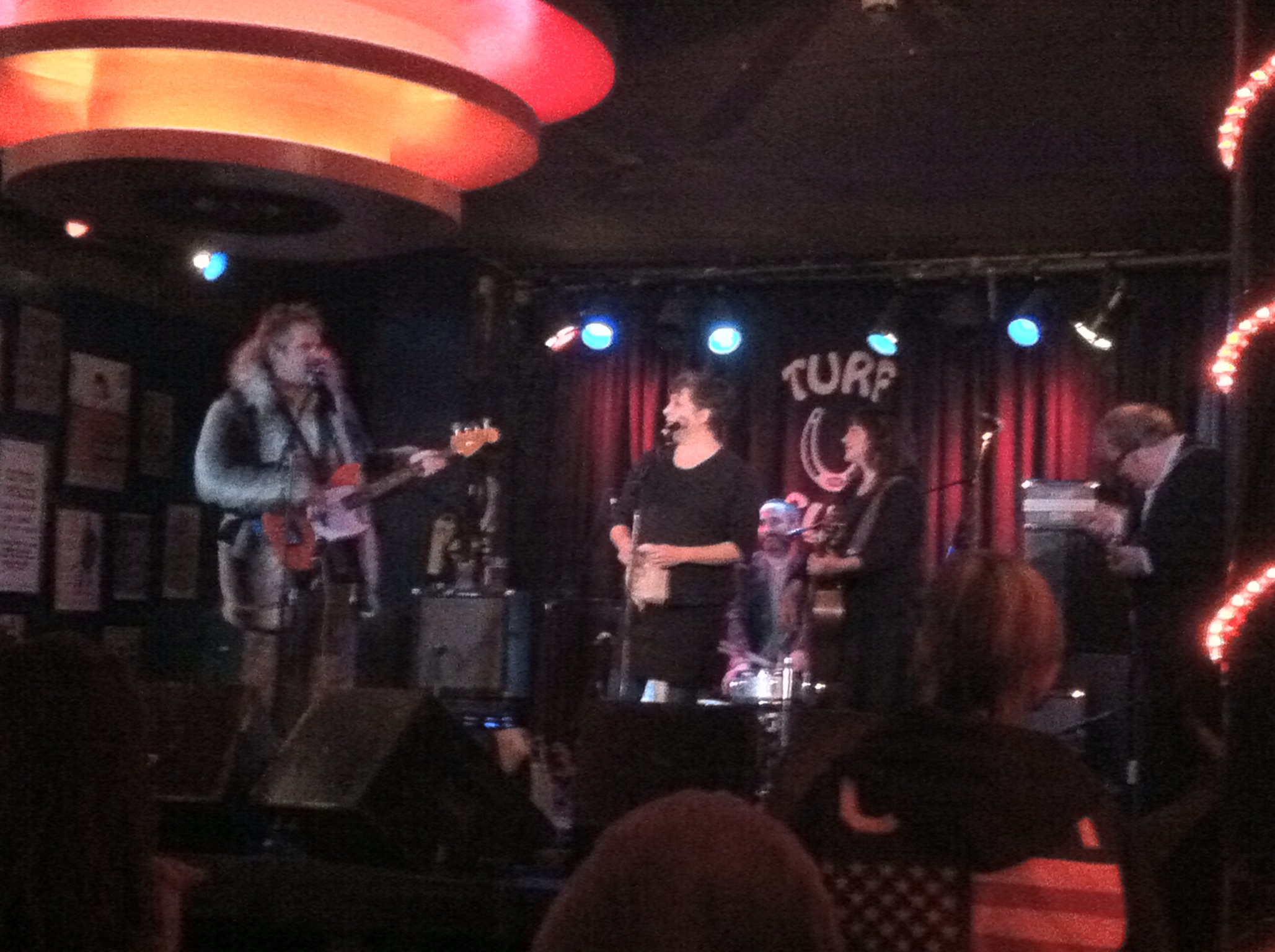 It was interesting to observe the difference in demeanor between the singing Kelly Hogan and the between-songs Kelly Hogan.  Although loose and fun-loving throughout, when singing, she seemed to enter the “zone” that artists and athletes speak about, with her gaze fixed on the ceiling or over the heads of the audience, thoroughly engrossed in the music.  Between songs, she was a bundle of nervous energy, fidgeting with her hair, chatting with her bandmates, and free-associating with the audience.  Relax, Kelly!  You’re clearly among friends.  Even during the slower, melancholy numbers (of which there were several), the normally boisterous Turf Club crowd kept the murmuring to a low volume.  Some fans delivered song requests on napkins to the front of the stage and one fellow even presented Kelly with a bag of fresh eggs (?).  A puzzler, that one, but Kelly loved it.
