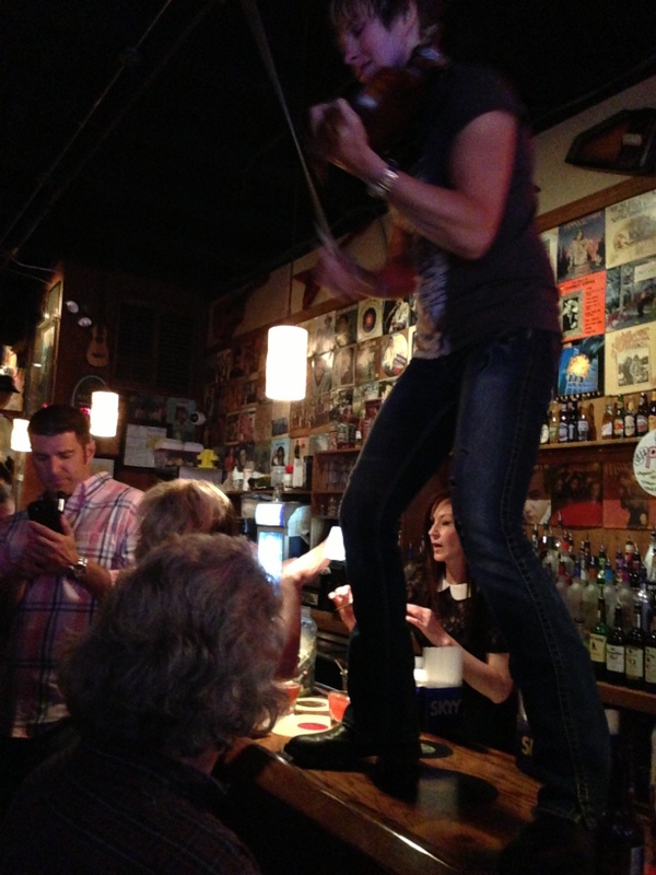 Local hottie on fiddle atop the bar at Legends on Broadway.